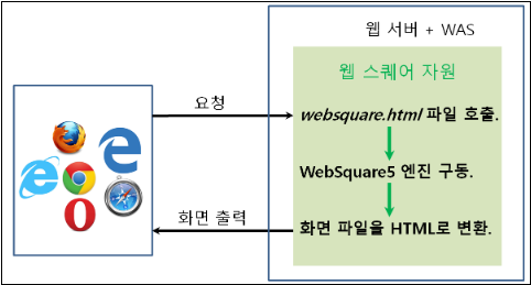 Upon the browser calling a web page written by WebSquare5, websquare.html file on the server side is first called. Then, the WebSquare5 Engine will run and the WebSquare5 code will be converted into HTML to be displayed on the browser. The following figure describes this process.