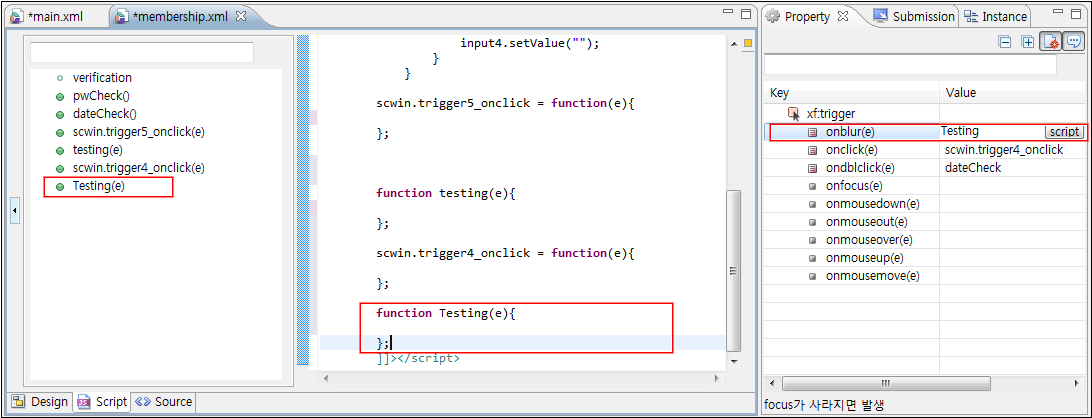 <xf:trigger id="trigger4" style="" type="button" ev:onclick="scwin.trigger4_onclick" ev:ondblclick="dateCheck" ev:onblur="Testing"> <xf:label> <![CDATA[OK]]> </xf:label> </xf:trigger>